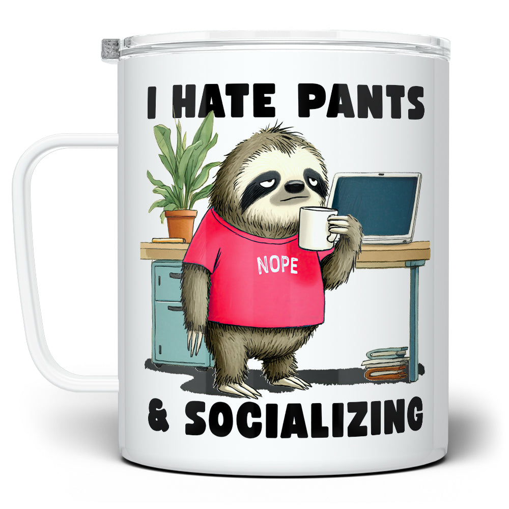 For those who’d rather stay home in sweatpants with coffee than make small talk in slacks—the Antisocial Sloth Insulated Mug is your spirit animal in mug form. Featuring a laid-back sloth standing in front of a work computer and the perfectly relatable quote “I Hate Pants & Socializing,” this mug is made for remote workers, introverts, and coffee-first personalities.