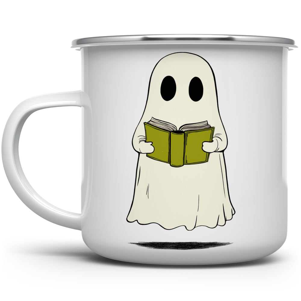 Get cozy with our Reading Ghost Camp Mug! This cute and bookish mug features an adorable ghost reading a book. Available in 12oz or 16oz, it's the perfect gift for any book lover. Add a touch of spooky and whimsy to your reading routine with this charming mug.