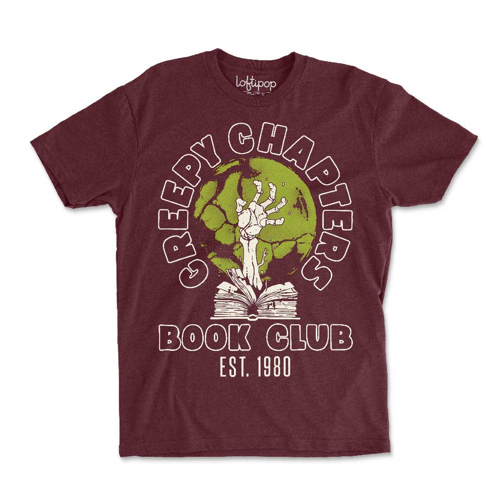 For readers who like their stories dark and their covers haunted, the Creepy Chapters Book Club T-Shirt delivers just the right dose of eerie charm. Featuring a distressed open book with a skeletal zombie hand reaching from its pages, this design is a Halloween-season favorite for spooky bibliophiles.