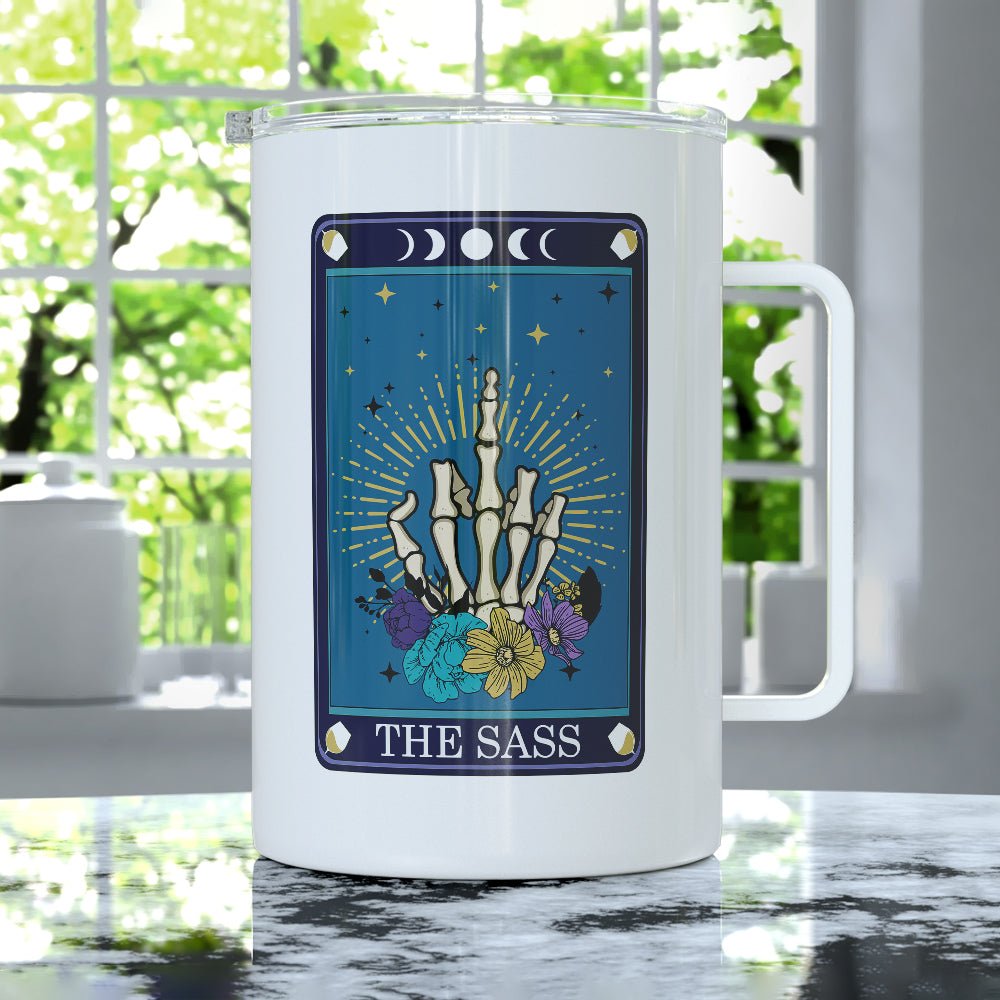 Unleash your inner sass with The Sass Tarot Card Insulated Travel Mug. This 12oz or 18oz mug is perfect for those who appreciate a snarky and humorous touch to their daily coffee routine. Say goodbye to boring mugs and hello to some serious (yet still funny) attitude.