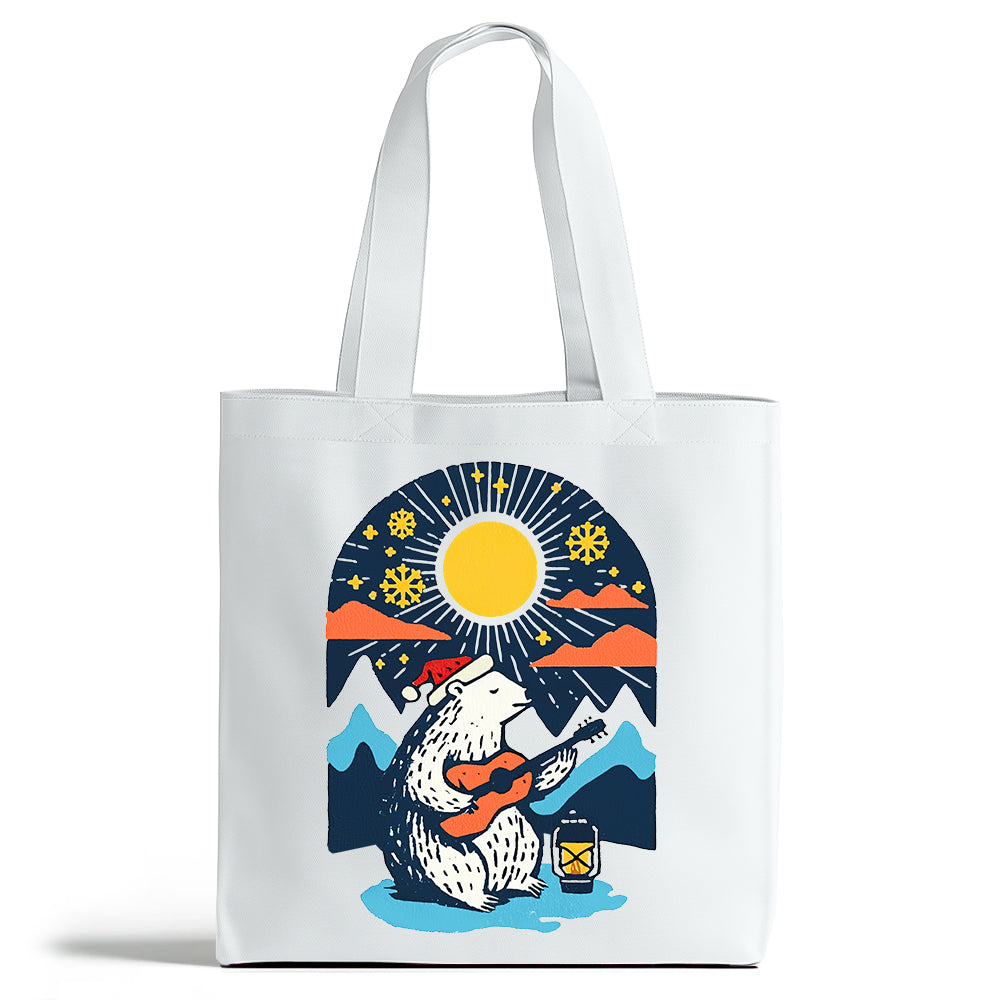 Add playful vintage charm to the holidays with the Retro Winter Polar Bear Tote Bag. Featuring a whimsical polar bear strumming a guitar with a retro mountain backdrop, this festive canvas tote blends music, holiday cheer, and nostalgic style. Perfect for Christmas shopping, carrying gifts, or cozy seasonal outings, it’s both practical and unique — making it a thoughtful gift for polar bear lovers, retro fans, and music enthusiasts alike.
