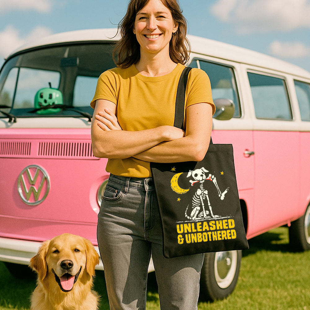 For dog parents with a spooky sense of humor, the Unleashed & Unbothered Skeleton Dog Tote Bag is howlingly perfect. Featuring a skeletal pup proudly trotting along with a human leg bone in its mouth and the phrase “Unleashed & Unbothered,” this tote brings Halloween laughs with every carry.